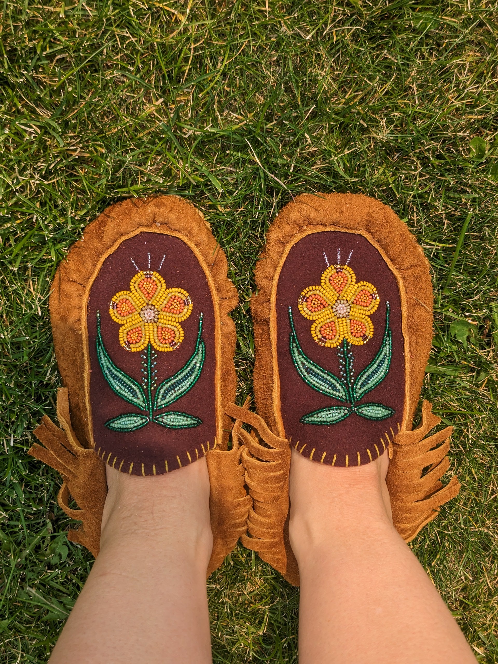 Creating beadwork, tuftwork and moccasins is a journey to honor my ancestors and learn about my culture. I draw inspiration from blood memory, traditional Métis motifs and personal stories. My subject matter includes plant identification, gardening, connection, place, mental health, motherhood and folk songs.