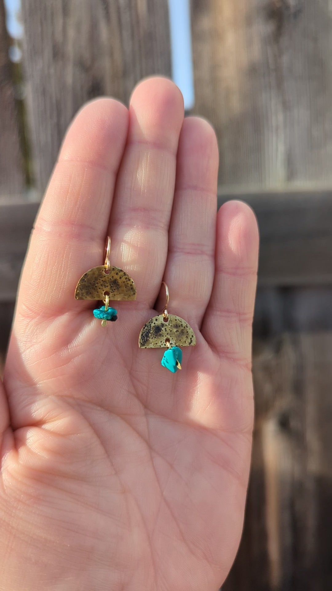 Hamdmaded hammered brass half circle earrings with a beautiful patina and turquoise chip beads. Gold filled hooks.